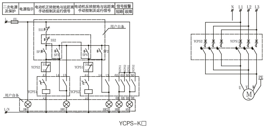 以YCPS控制與保護開關(guān)電器為主開關(guān),構(gòu)成可逆型電動機控制器YCPS-K,適用于可逆型電動機的控制與保護。