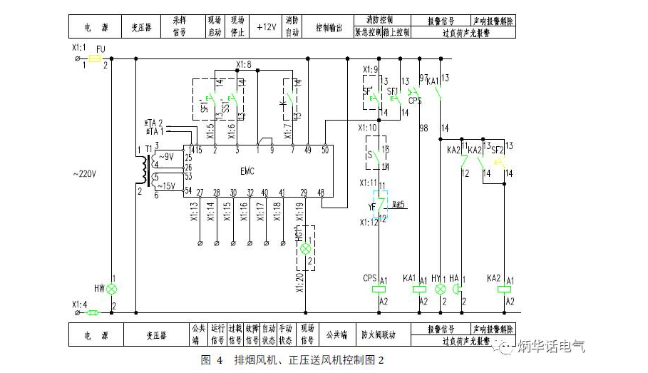 圖3是排煙風(fēng)機和正壓送風(fēng)機控制圖,其主回路參見圖1b,為CPS方案,適合于交流380V單臺消防排煙風(fēng)機或正壓送風(fēng)機的現(xiàn)場控制或兩地控制,過載保護只報警,風(fēng)口(或風(fēng)閥)上的微動開關(guān)直接與風(fēng)機聯(lián)動,消防聯(lián)動模塊提供無源動合觸點,當(dāng)消防系統(tǒng)提供有源觸點時,取消變壓器T。只有現(xiàn)場控制時,取消SS1'、SF1'、S、HG'并將X1:5與X1:6短接,X1:6與X1:7斷開,X1:7與X1:8短接,X1:10與X1:11斷開。圖中CPS包含線圈、過載保護觸點,動合觸點、動斷觸點。用于正壓送風(fēng)機控制時,將X1:8與X1:9短接。